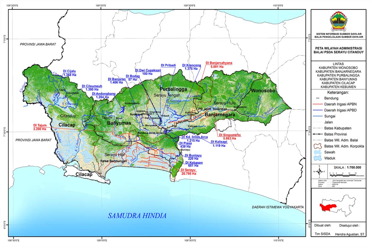 Secara administrasi potensi sumber daya air di Wilayah Kerja Balai PSDA Serayu Citanduy meliputi 2 Wilayah Sungai yakni WS Serayu (181 Km) dan WS Citanduy Timur (128 Km), yang melintasi Kabupaten Wonosobo, Banjarnegara, Purbalingga, Banyumas, Cilacap dan sebagian Kebumen. Serta mempunyai 13 Daerah Irigasi kewenangan Provinsi Jawa Tengah dengan luas areal layanan mencapai 10.463 Ha dan 4 Daerah Irigasi kewenangan pusat dengan luas areal layanan 34.859 Ha.