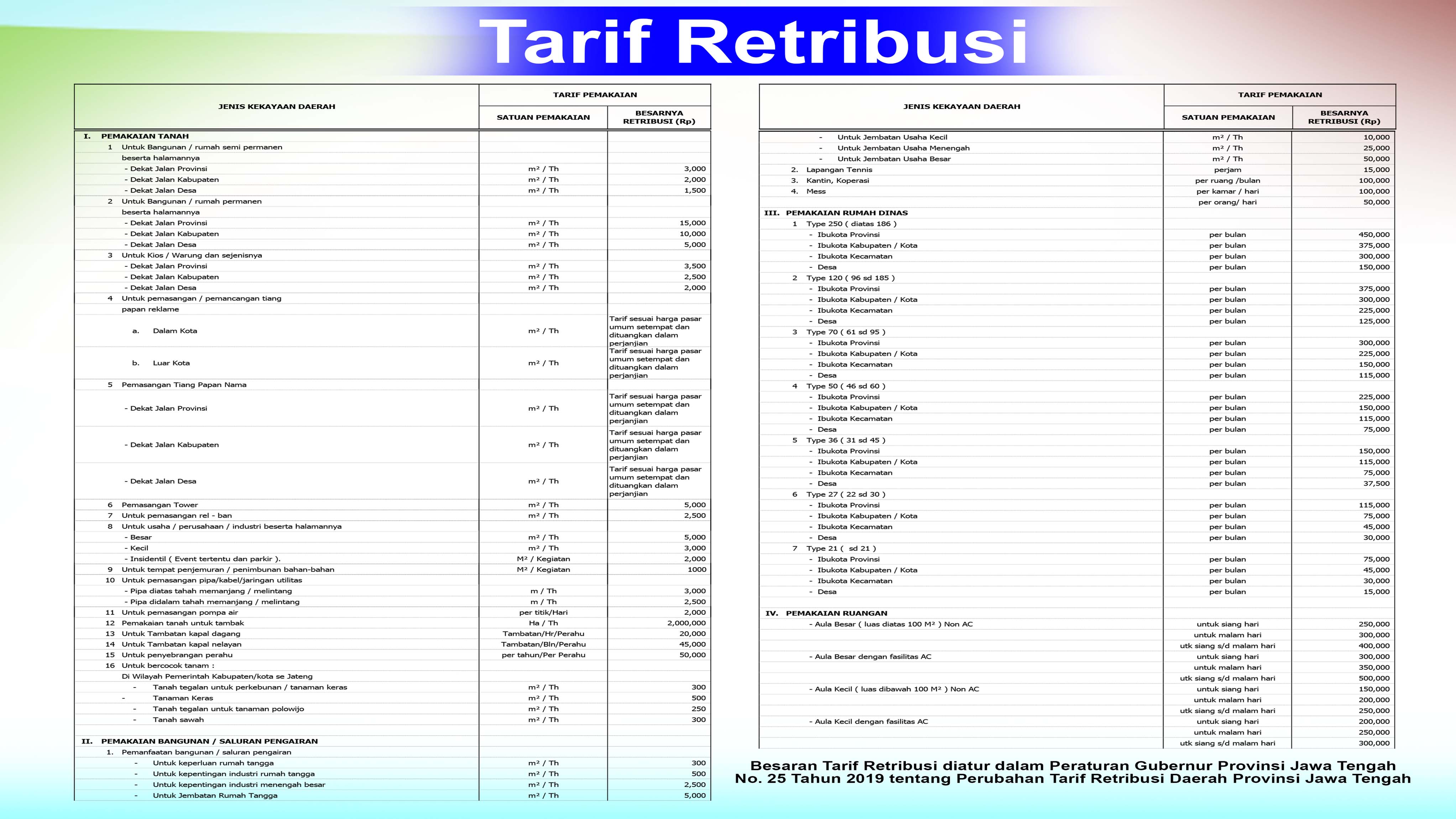 Besaran tarif Izin Pemakaian Tanah dan / atau Bangunan berdasarkan Peraturan Gubernur Jawa Tengah No. 25 Tahun 2019 Tentang Perubahan Tarif Retribusi Daerah Provinsi Jawa tengah adalah sebagai berikut :